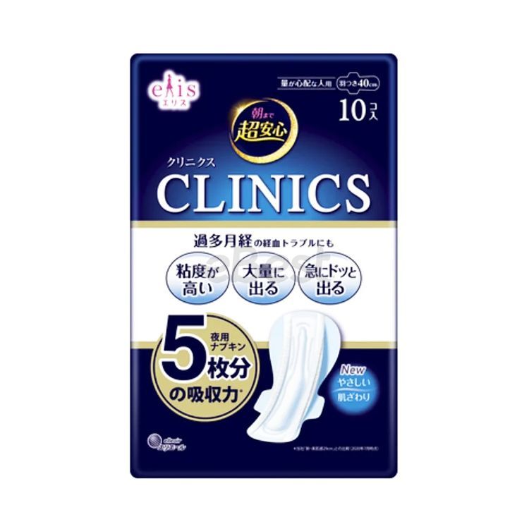 Elis sanitary napkin CLINICS series night use 10-piece 40cm winged sanitary napkin is a highly absorbent sanitary napkin specially designed for night use. It is suitable for women with heavy flow at night. It is comfortable and leak-proof designed, especially suitable for night use, providing comprehensive protection.