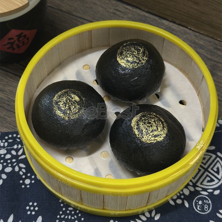 Handmade double enjoyment of natural bamboo charcoal powder. Storage method: frozen for 180 days. Consumption method: steam for 8 minutes after the steamer is on. Product formula: salted egg yolk, wheat flour, butter, bamboo charcoal powder, gold powder, sugar. Purely handmade and homemade. The outer skin is natural bamboo charcoal powder, matched with 90% salted egg yolk, without any additives. When you bite it, the rich quicksand flows out, giving you a double enjoyment of vision and taste.
