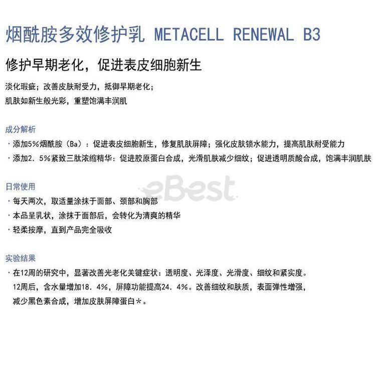 Metacell Renewal B3 is a skin firming cream utilising a unique aqueous emulsion to deliver a high concentration of 5% niacinamide (vitamin B3). Studies reveal that there are several environmental factors that cause skin to exponentially show signs of premature ageing. Geography, lifestyle, diet, sun exposure and skincare regime all contribute to the look, feel and overall health of skin. Combined with a firming tripeptide concentrate, and 15% pure glycerin, this cell renewal cream directly addresses early signs of skin ageing.