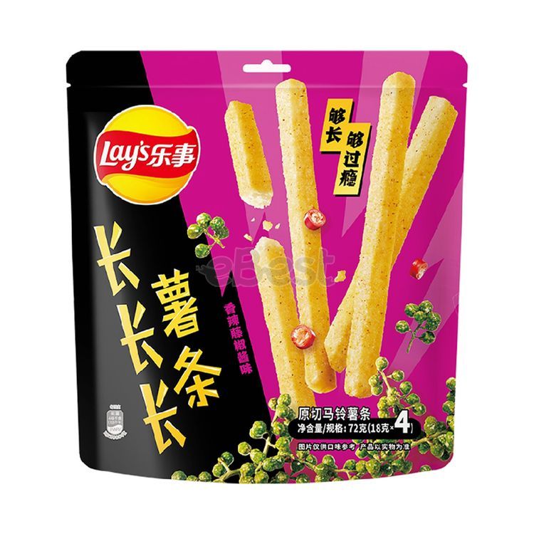 Spicy and spicy potato chips Lay's super long potato chips are made with spicy pepper sauce. The whole potato is cut into strips and baked to retain the toughness of the crude fiber. It is coated with Sichuan pepper sauce powder. It tastes crispy and spicy at first, and then the spiciness increases. The individual packaging locks in the crispness. You can't stop eating one after another when watching TV series. It is a great decompression tool for spicy lovers!