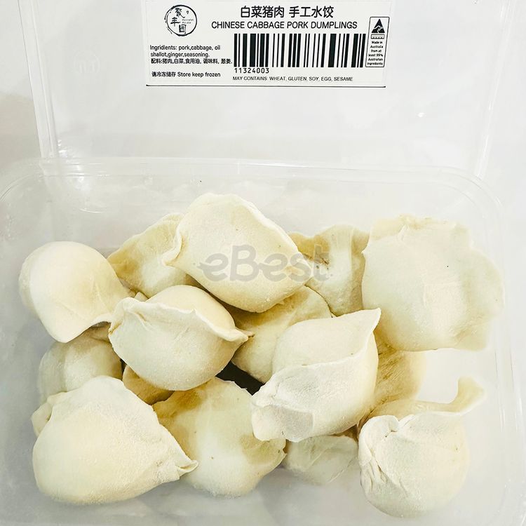 Sweet cabbage and tender meat filling. Classic flavor. Storage method: frozen for 90 days, refrigerated for 3 days. Product ingredients: pork, cabbage, flour, seasoning, cooking oil. How to eat: after thawing, steam on low heat. Microwave for 2 minutes after thawing. Purely handmade large dumplings, chewy dough, with meat filling in delicious soup. Steaming dumplings are served on the table, which is the taste of home.