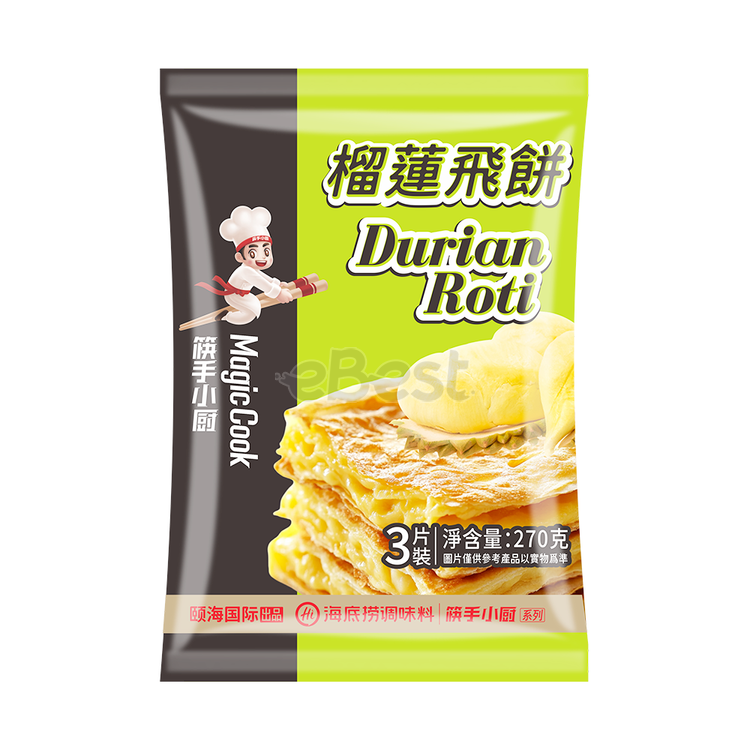 The tropical Haidilao Durian Flying Pancake (270g) is filled with durian pulp. The Thai golden pillow durian pulp accounts for ≥ 30%. The pancake skin is hand-tossed into a thin layer as thin as a cicada's wing and can be eaten after quick frying in 3 minutes.