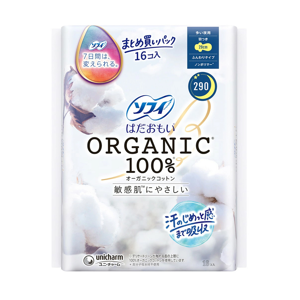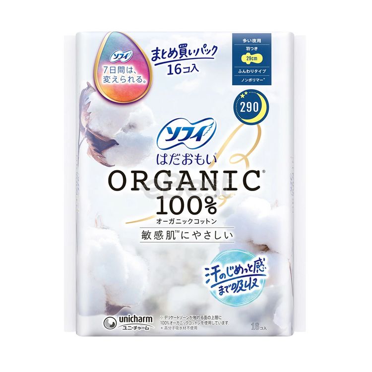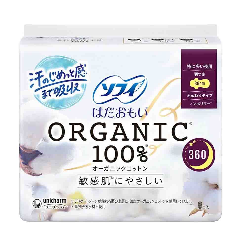 Unicharm Sophie Hadaomoi ORGANIC 100% Organic Cotton 360 Especially Common Night Use With Feathers 36cm Fluffy Type 8 pieces