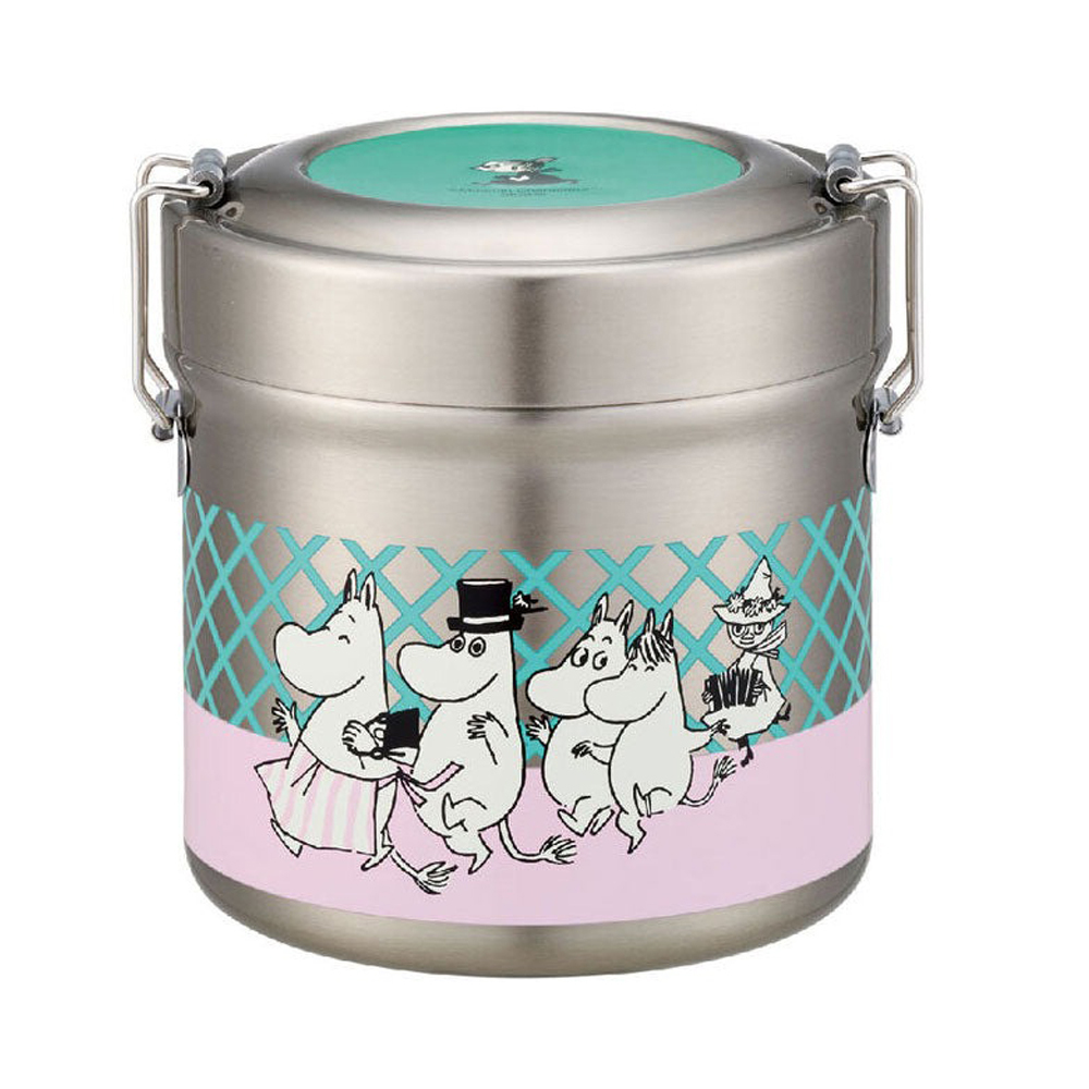 Double-layer insulated lunch box with practical compartments for the Moomin family: 1. 600ml capacity, ultra-light and compact, easy to carry; 2. Perfect for warm, fresh rice in winter and cool lunches like noodles in summer; 3. Microwaveable inner pot by removing the inner lid; never microwave the box itself; 4. Base made of scratch-resistant, non-slip rubber.