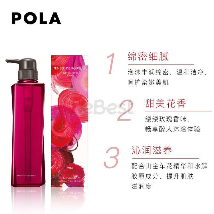 Rich foam, rich and dense foam, gently cleans the skin, leading to moisturizing and smooth skin after bathing; sweet floral fragrance, wisps of rose fragrance, enjoy an intoxicating bathing experience; with arnica flower essence and hydrolyzed collagen ingredients, enhance skin moisture; elegant Floral fragrance, layers of bloom.