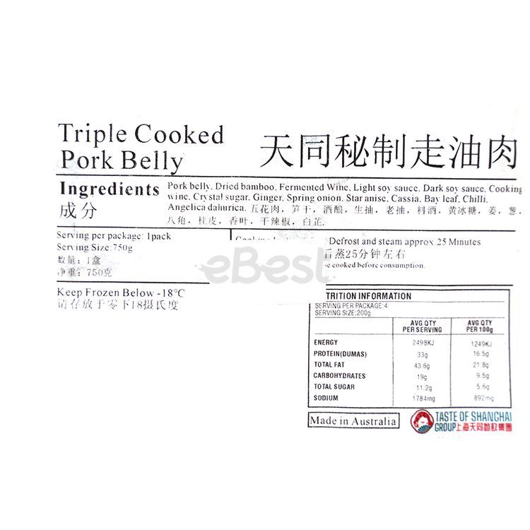 Shanghai Tiantong Special Oil Cooked Pork 750g Frozen