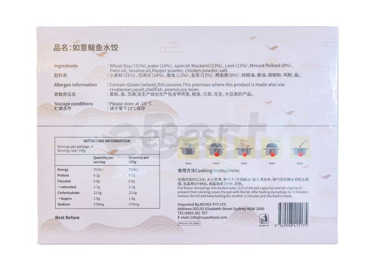Ruyee Mackerel Dumplings are a type of Asian dumpling that are made with a filling of mackerel fish and other ingredients, wrapped in a thin dough wrapper. The mackerel is typically seasoned with various spices and herbs to give it a savory and flavorful taste.