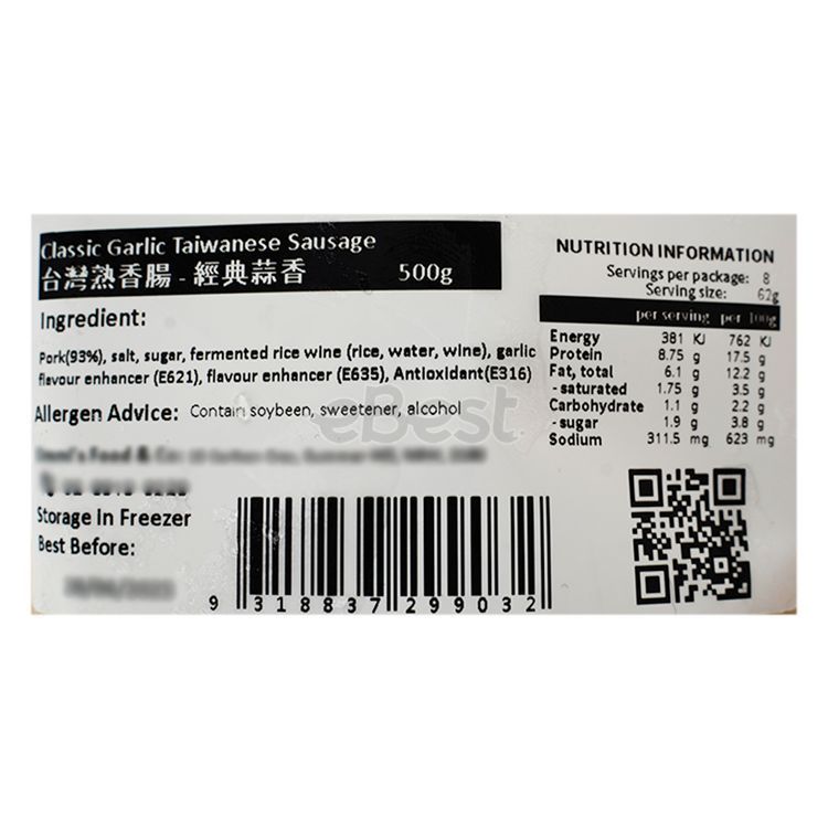 Authentic Taiwanese-style sausages made locally in Australia by Ommi's Food & Co. These sausages are steamed in Ommi's kitchen and then quickly frozen to preserve the maximum flavor. With their deliciously sweet and juicy taste, these Taiwanese sausages can be easily heated at home for your enjoyment.