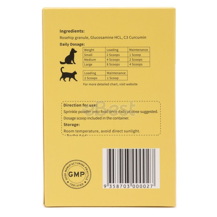 Core brief: Natural gold-grade curcumin C3 with rosehip is powerful anti-inflammatory to protect joint health. Product Description: Contains powerful anti-inflammatory natural ingredients - Rosehip and C3 Curcumin. Powerful against joint inflammation in pets and helps with joint health, immune system and mild infections. Key Ingredients: - C3 Curcumin: Effectively reduces inflammation and contributes to joint health. - Rosehip Granules: Boosts the immune system and is rich in disease-fighting antioxidants. And contains galactolipids, which have been shown to reduce inflammation. - Glucosamine hydrochloride: protects chondrocytes, helps maintain cartilage structure, slows articular cartilage degradation and prevents cartilage from breaking down. Product Features: - Formulated by Australian Veterinary Professionals - Supports joint health. - Effectively reduce joint inflammation. - Helps boost immune function. - Gold Standard C3 Curcumin. - Suitable for cats and dogs of all ages. How to use: There is a small spoon in the product bottle, and the powder product is sprinkled on the pet food according to the measurement.