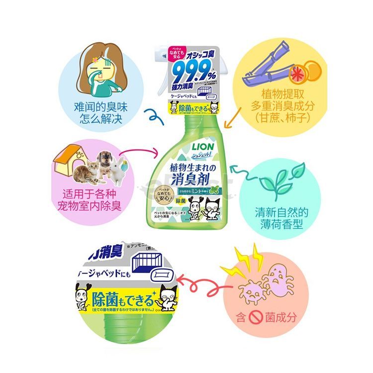 1. Mint flavor, plant extract, contains multiple deodorizing ingredients of sugar cane, grapefruit and mint leaves, eliminates various indoor compound odors, and is natural and safe. 2. Contains antibacterial ingredients, high efficiency antibacterial up to 99.9%, can effectively inhibit bacteria in daily life such as Escherichia coli and Staphylococcus aureus. 3. Suitable for all kinds of pet indoor deodorization and deodorization around house cloth products, pet cabins and pet toilets.