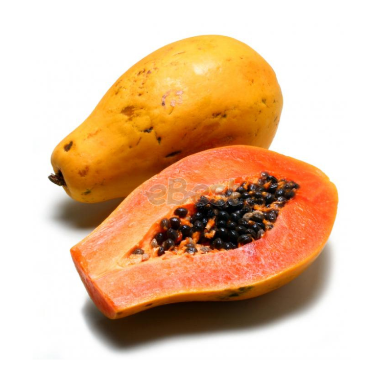 Papaya is a large, pear-shaped fruit with a thin, smooth skin that can vary in color from green to yellow or orange, depending on the stage of ripeness. When ripe, papaya has a soft and juicy flesh that ranges from bright orange to pink. The center of the fruit contains small black seeds that are edible but often scooped out before consuming.
