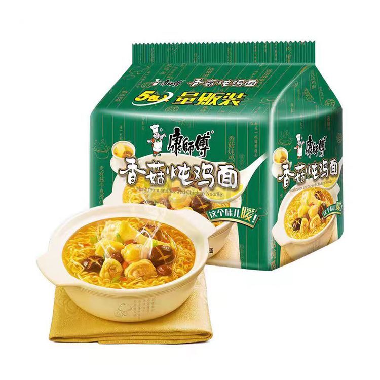 Kangshifu Mushroom Chicken Stew Flavored Instant Noodles come in a convenient pack of five, offering a delicious and comforting meal option. Each pack contains 100g of instant noodles, pre-seasoned with a flavorful mushroom chicken stew flavor. The noodles have a satisfying texture, and the mushroom chicken stew seasoning adds a savory and aromatic taste to the dish. Kangshifu Mushroom Chicken Stew Flavored Instant Noodles are easy to prepare - simply add hot water, cover, and let it sit for a few minutes. They are a popular choice for quick and tasty meals, especially for those who enjoy the comforting flavors of mushroom and chicken stew.