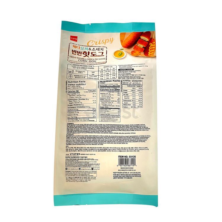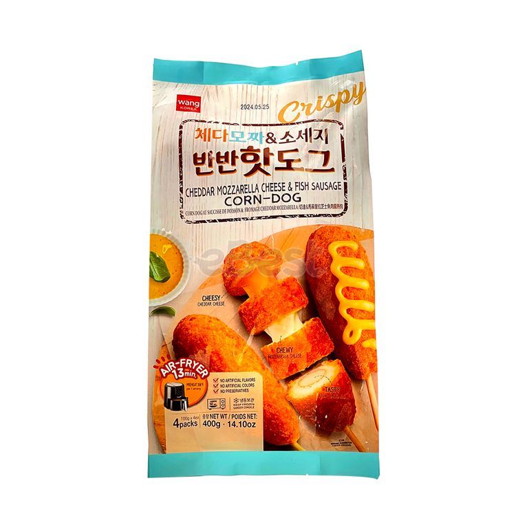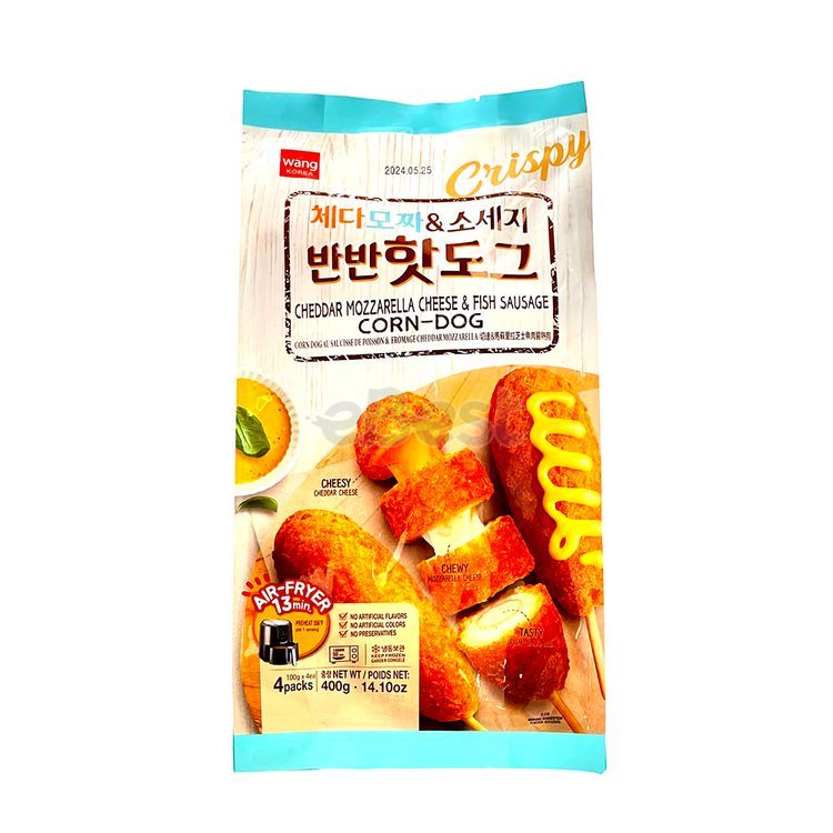 Enjoy the authentic flavours of Korean street food at home with Wang Cheddar Mozzarella Cheese & Fish Sausage Corn Dog. This pack of 4pcs delivers a delightful combination of cheddar and mozzarella cheese with a savoury fish sausage, encased in a golden corn batter. Cook them easily in the microwave, air fryer, or oven. Free from artificial flavours, colours, and preservatives, these corn dogs offer a delicious and convenient snack option. Indulge in the crispy texture, cheesy goodness, and rich flavours. Experience the taste of Korean street food anytime, anywhere with Wang Corn Dog.
