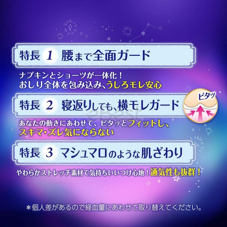 Sanitary napkins + panties are combined into one, with a cotton candy-like skin feel, and stretchable materials are used regardless of the abdomen and waist, which is extremely soft and comfortable to wear.