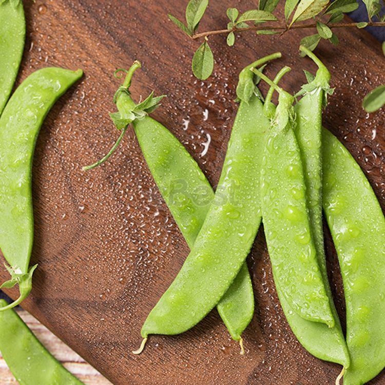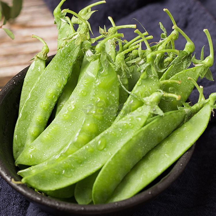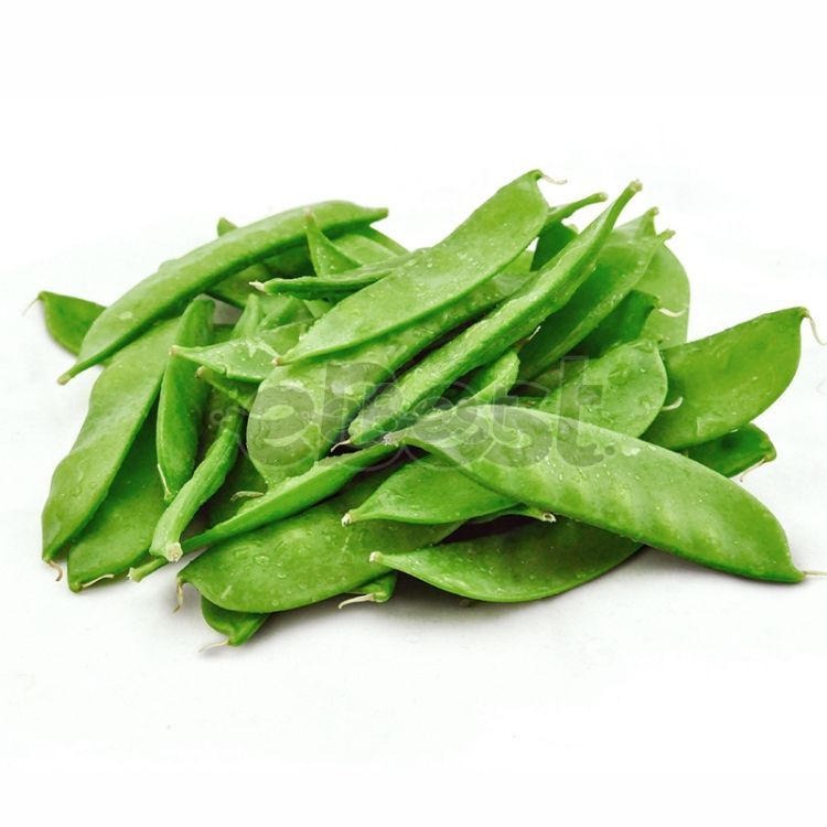 Snow peas are flat, bright green pods that are eaten whole. They have a crisp texture and a slightly sweet flavor, often used in stir-fries and salads.