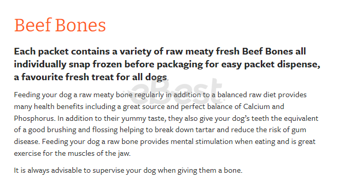 Each packet contains a variety of raw meaty fresh Beef Bones all individually snap frozen before packaging for easy packet dispense, a favourite fresh treat for all dogs. Feeding your dog a raw meaty bone regularly in addition to a balanced raw diet provides many health benefits including a great source and perfect balance of Calcium and Phosphorus. In addition to their yummy taste, they also give your dog's teeth the equivalent of a good brushing and flossing helping to break down tartar and reduce the risk of gum disease. Feeding your dog a raw bone provides mental stimulation when eating and is great exercise for the muscles of the jaw. It is always advisable to supervise your dog when giving them a bone.No weight bearing bones included.-Peti