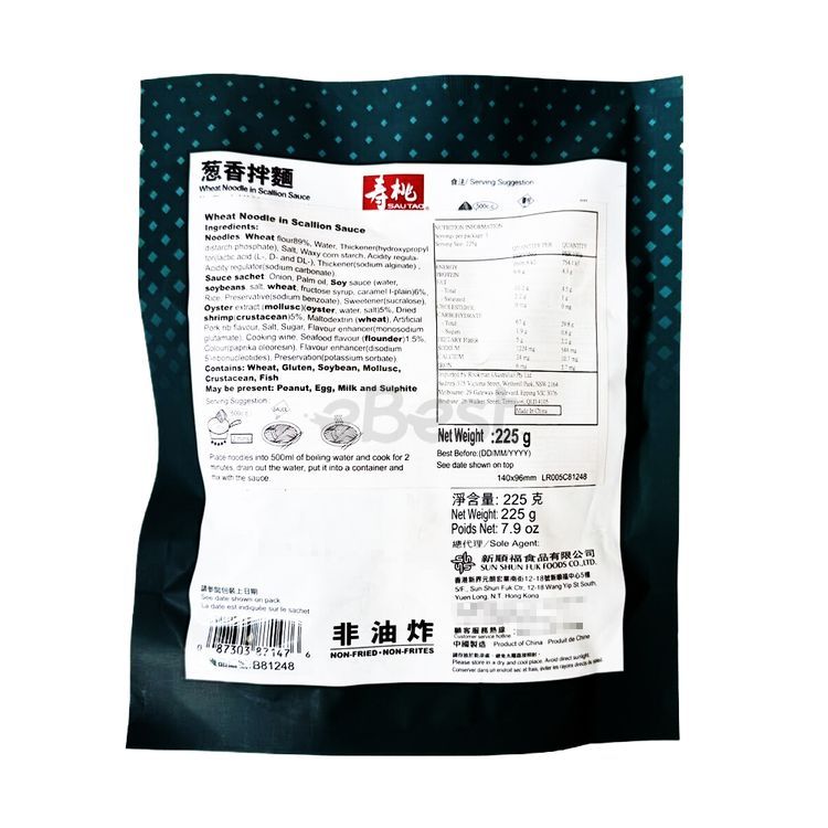 Shoutao scallion flavored mixed noodles (non fried) 225g, carefully selected high-quality noodles, paired with thick scallion flavored sauce. Non fried is healthier, with a strong and smooth taste, a strong aroma, and rich nutrition. It can be opened and eaten immediately or microwave heated, convenient and fast, without adding artificial colors or preservatives. It is an ideal choice for those who pursue healthy drinking.